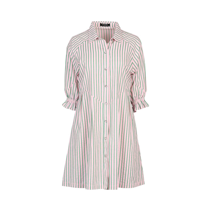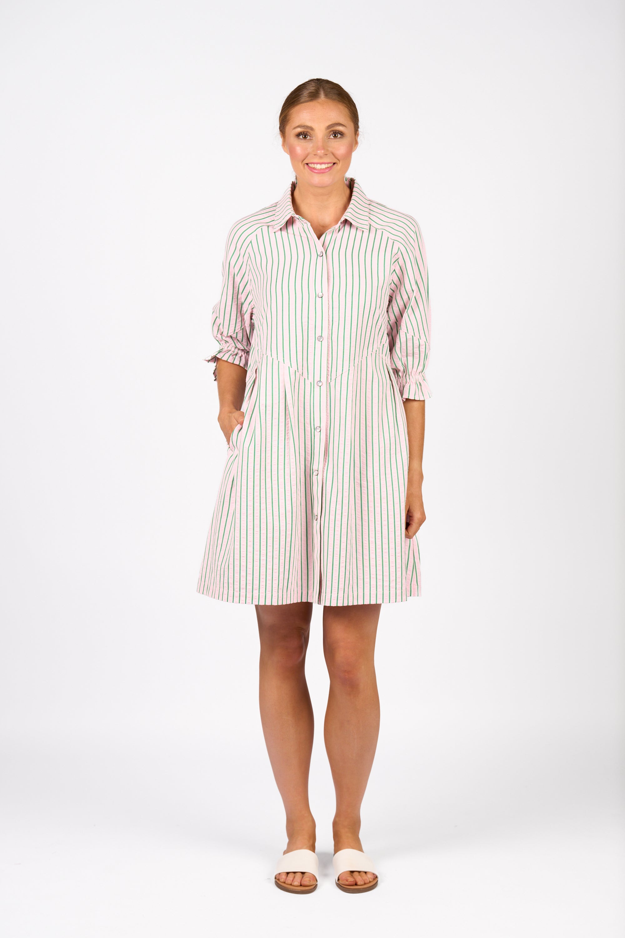 The Piper Dress in Candy Apple is an easy summer throw-on, cut in a crisp pink and green striped cotton-blend. With pleat detailing and soft raglan sleeves, it has a relaxed charm that makes everyday dressing feel a little more fun.