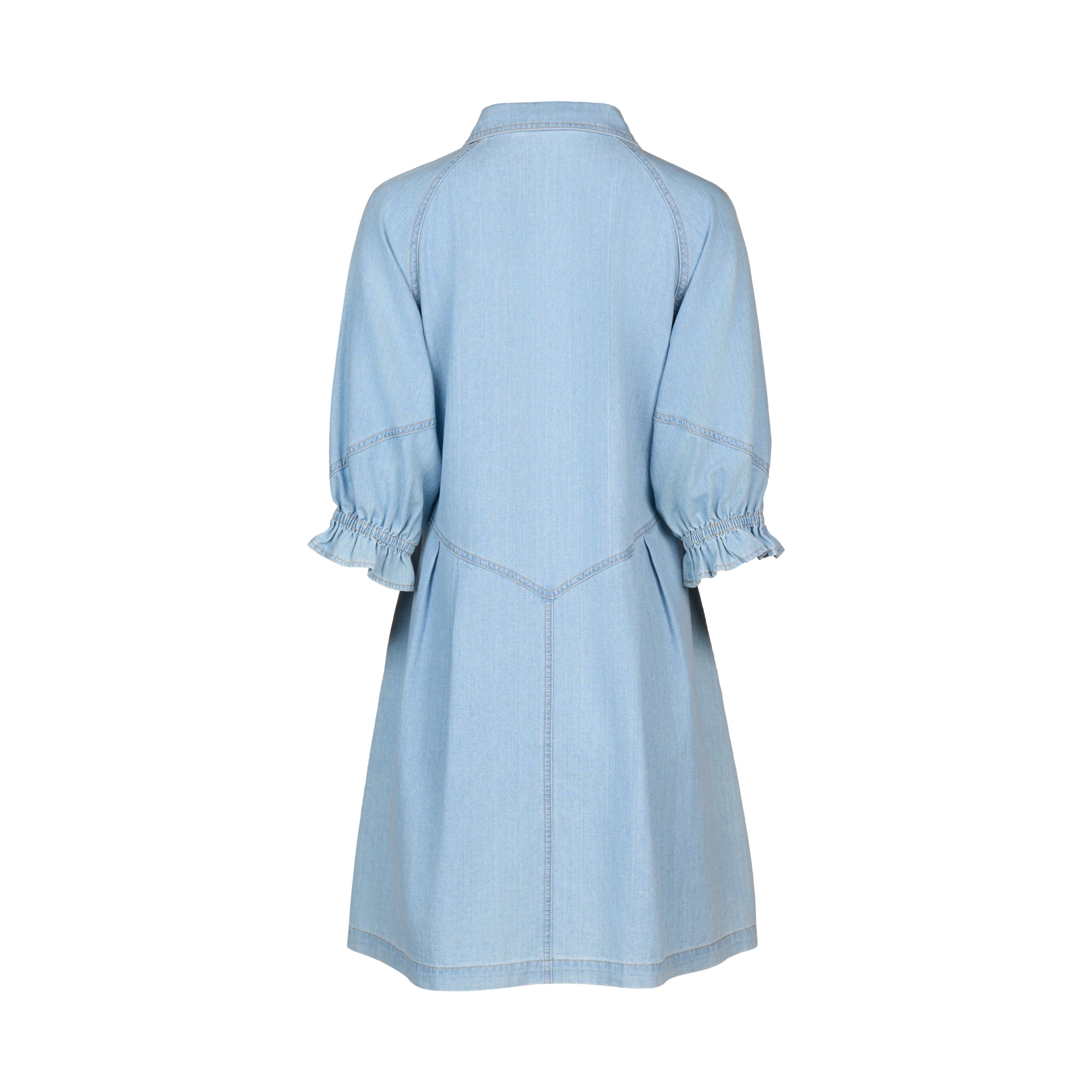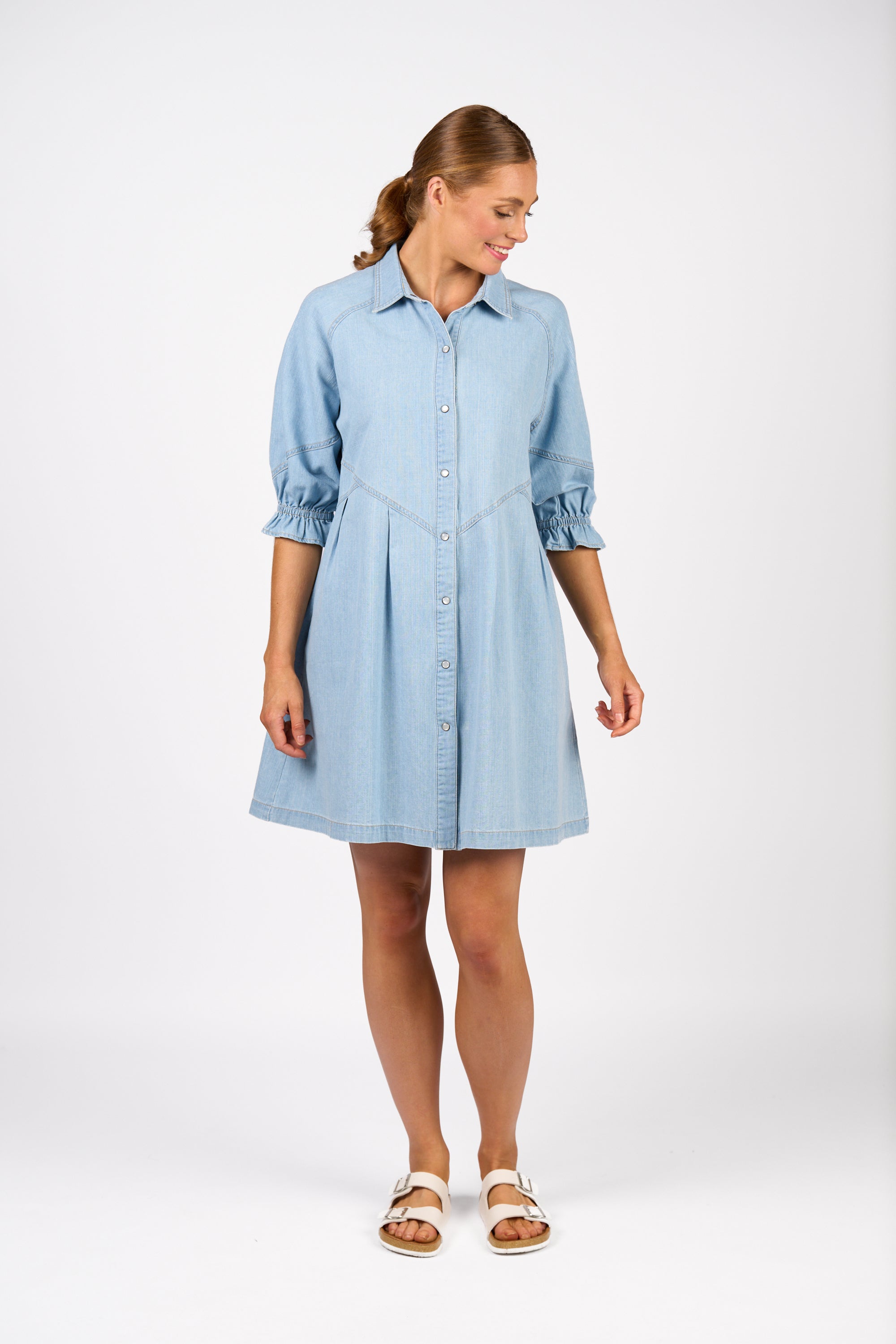 The Piper Dress in Light Wash is made from a lightweight 100% cotton fabric with a denim look. It features mid-length raglan sleeves with elasticated cuffs, a popper front, and subtle pleated seam details that add shape to its relaxed fit. Side pockets complete this versatile, casual dress perfect for everyday wear.