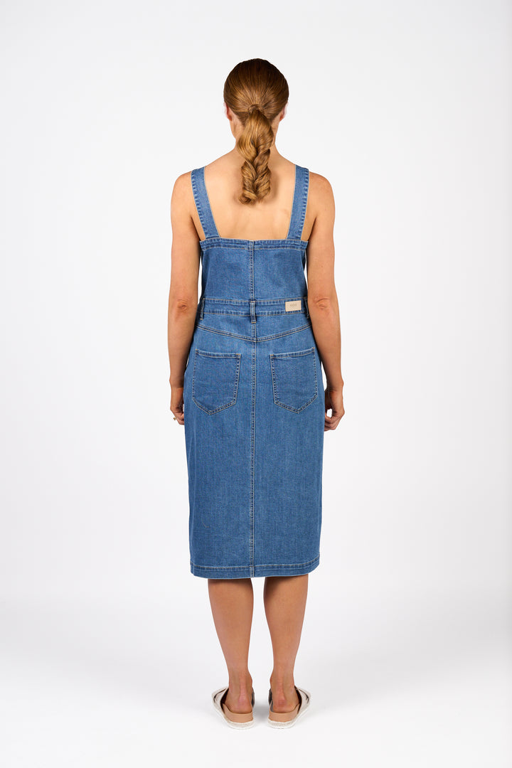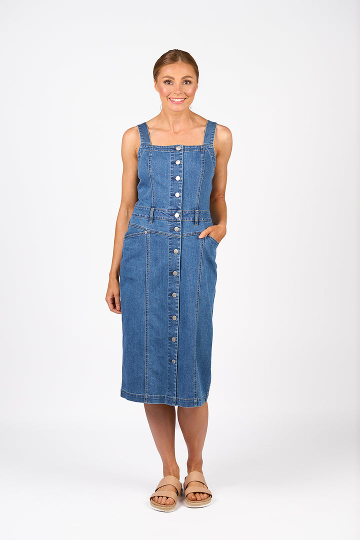 The Novel Dress is a sleeveless denim style with a straight neckline and metal button-up front. Made from stretch denim in a flattering midi length, it’s shaped through the body to create a structured yet easy silhouette with a casual edge.