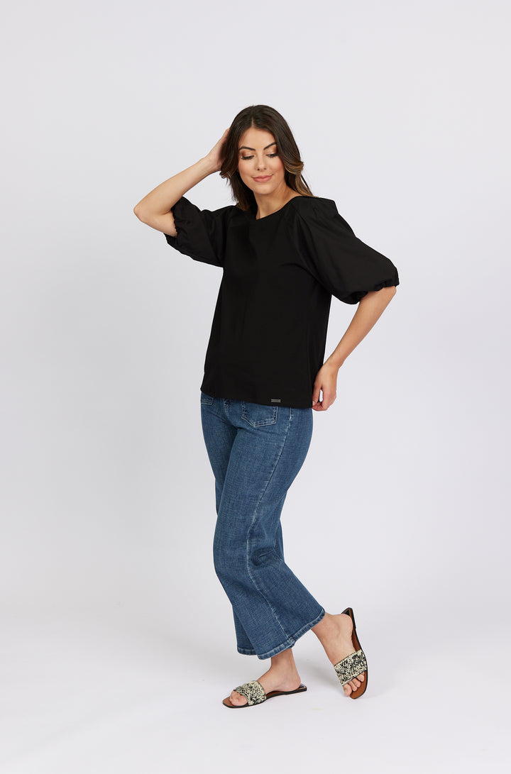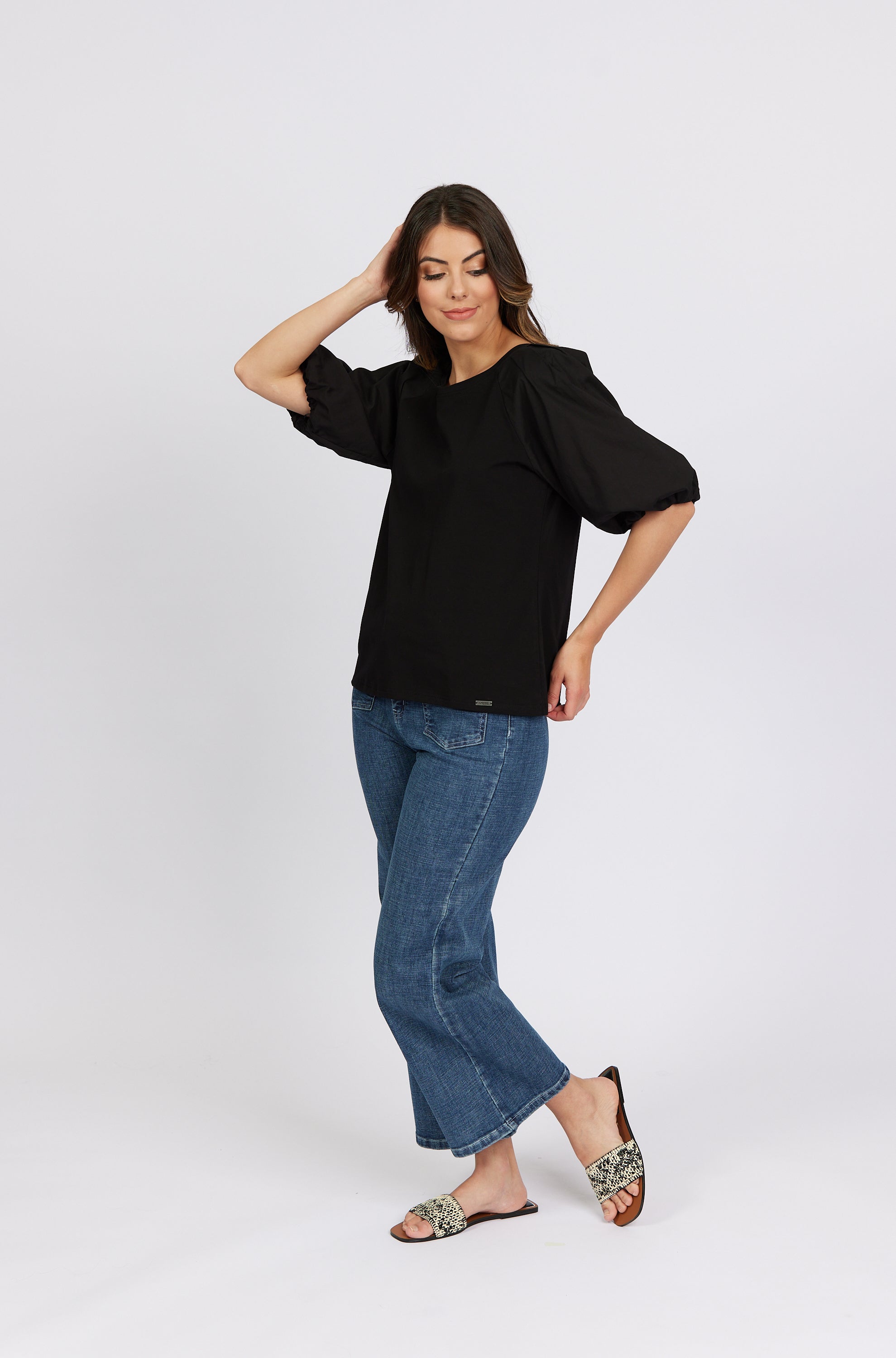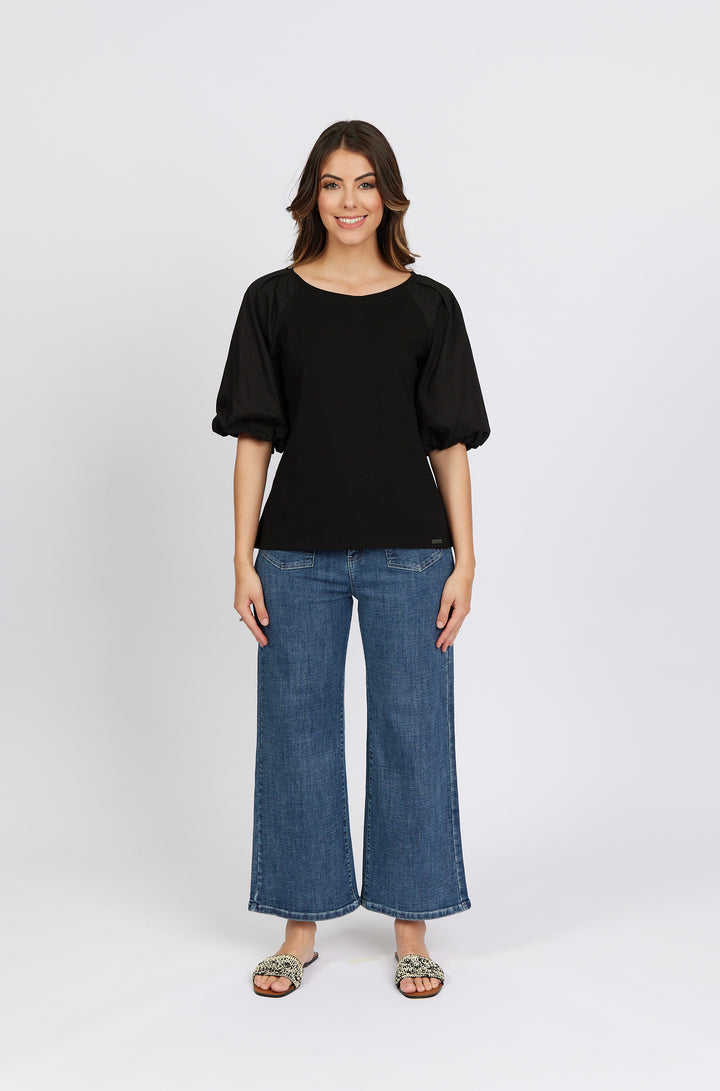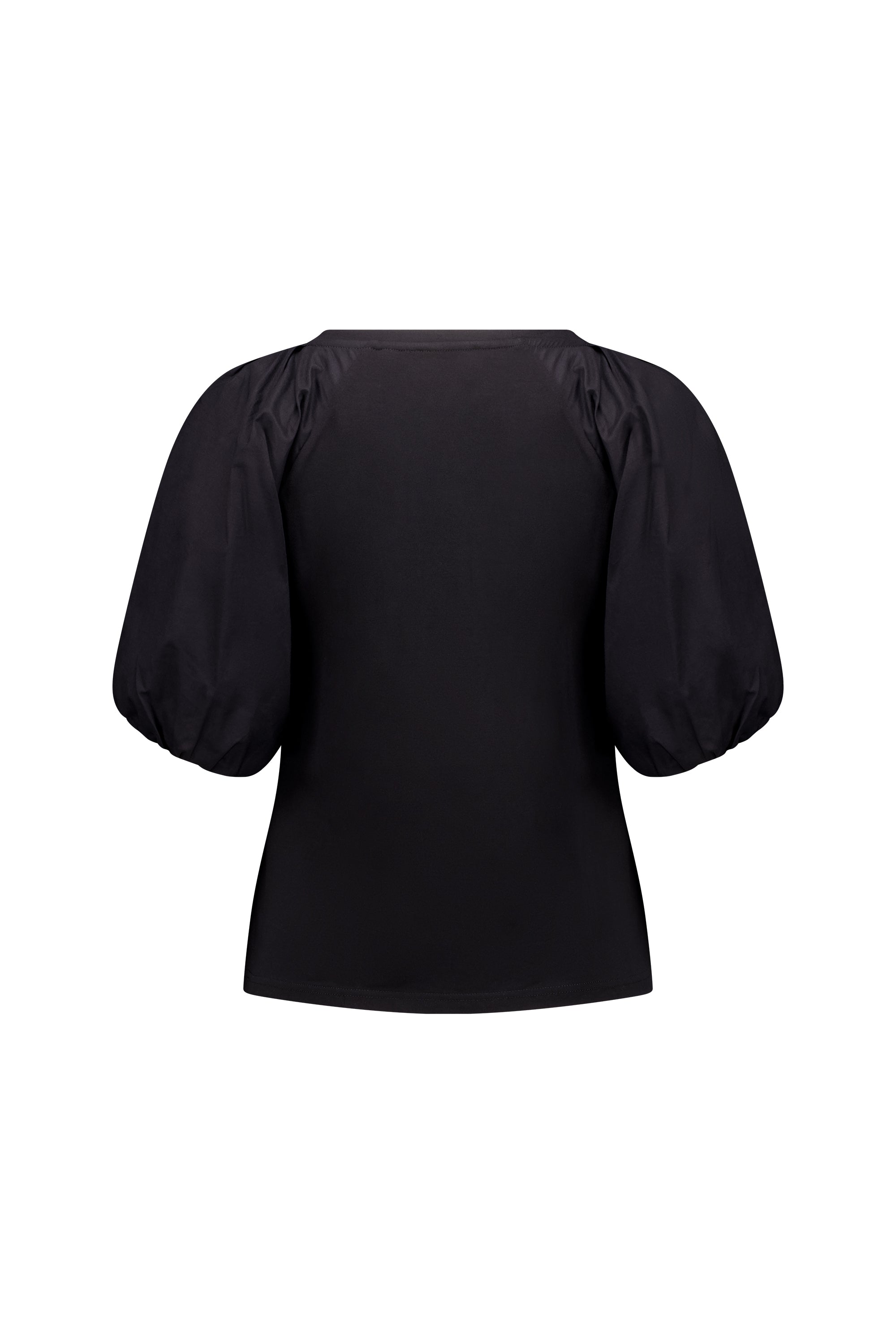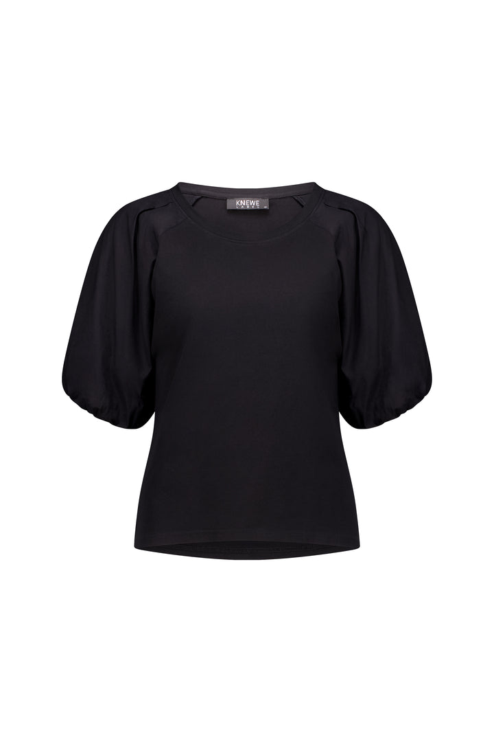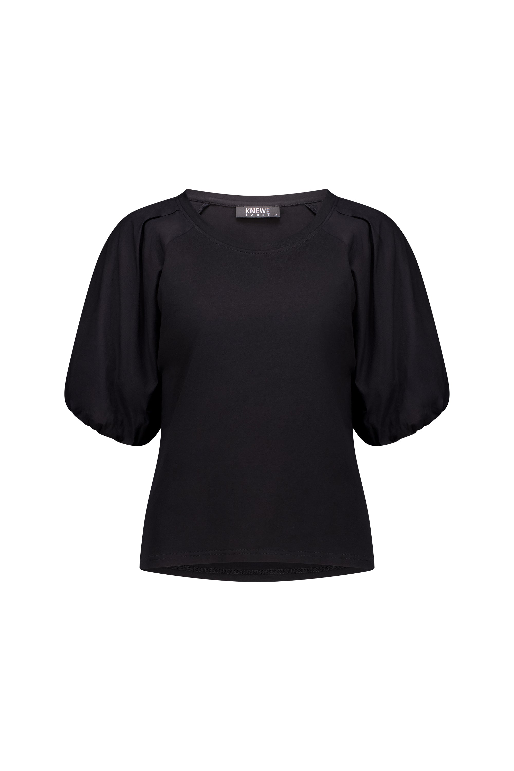 • Short raglan puff sleeves with a relaxed elastic opening and pleats along neck edge