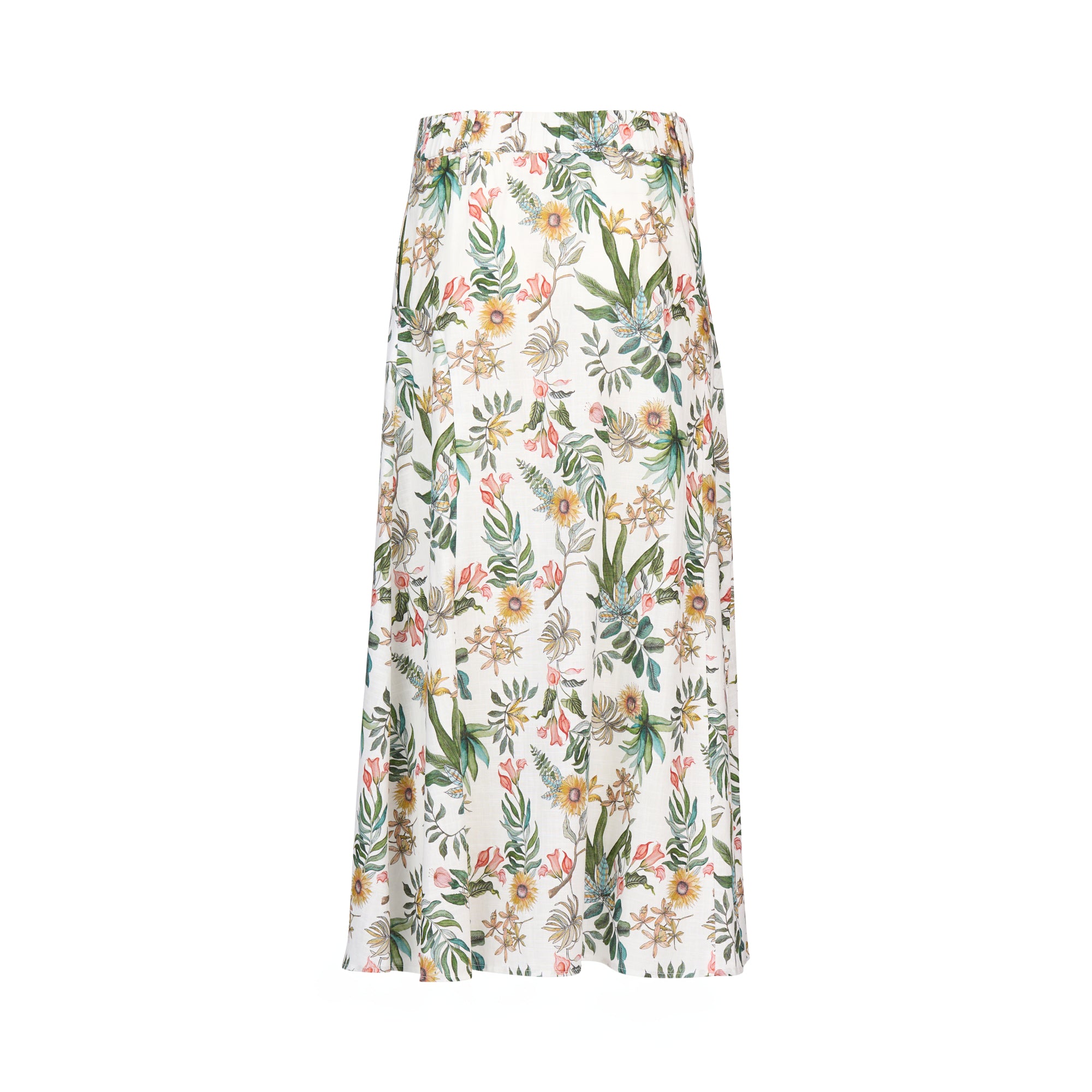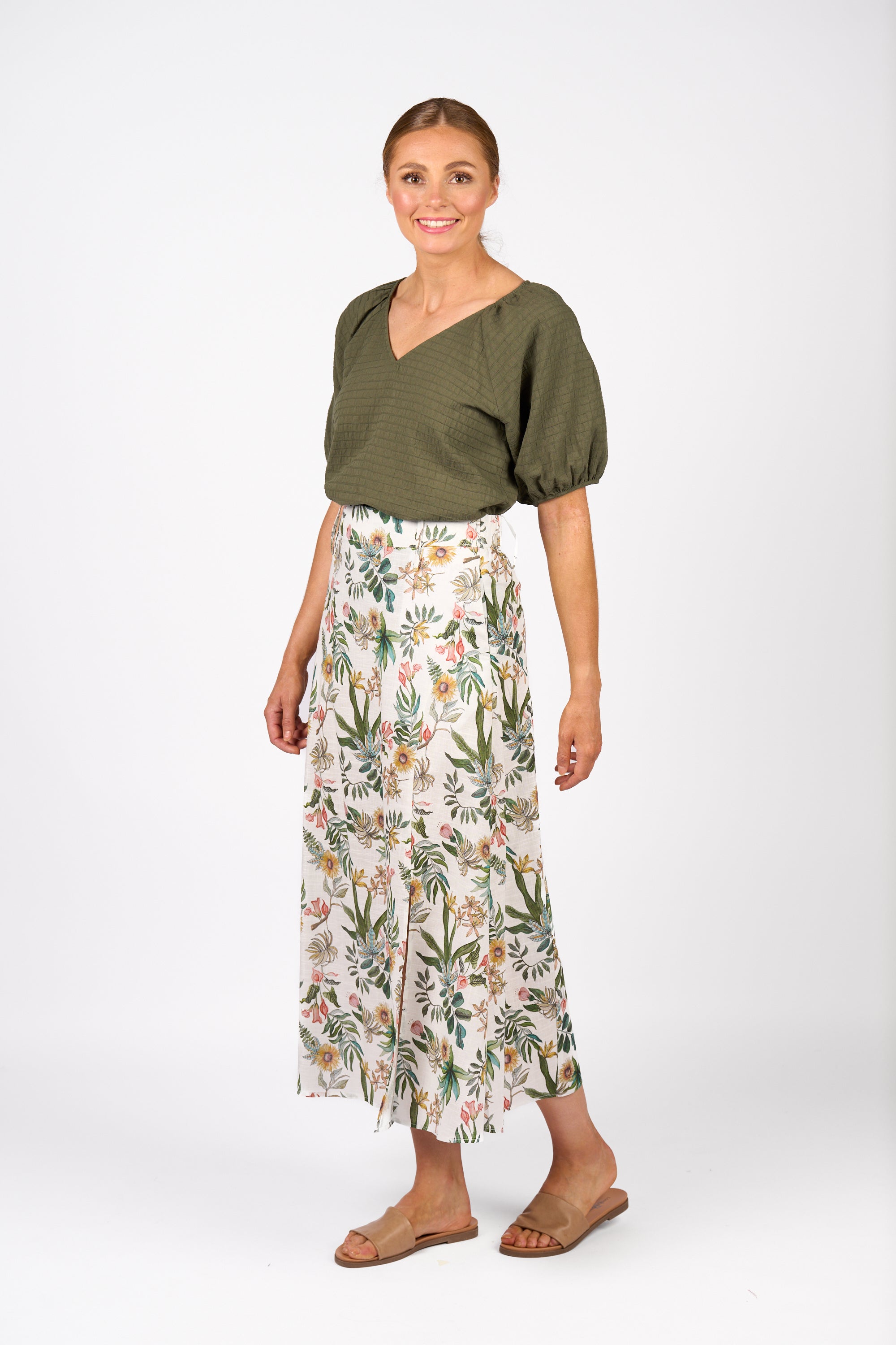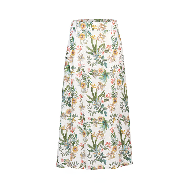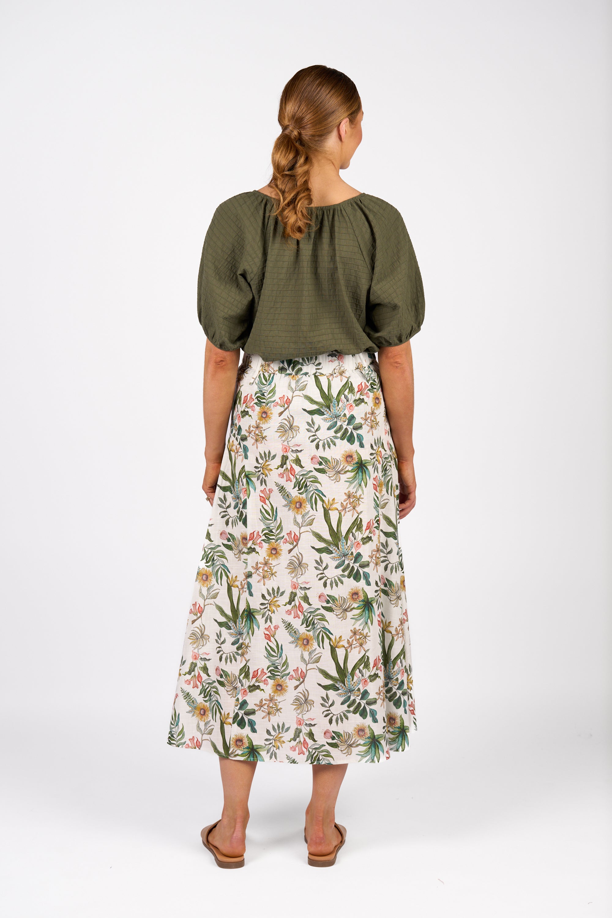 The Tempo Skirt in the Wild print is made from a 100% cotton fabric with a linen look, giving it a soft, breathable feel. It features two front seam splits and a flat front waistband with an elasticated back, making it an easy, polished option for warm days.