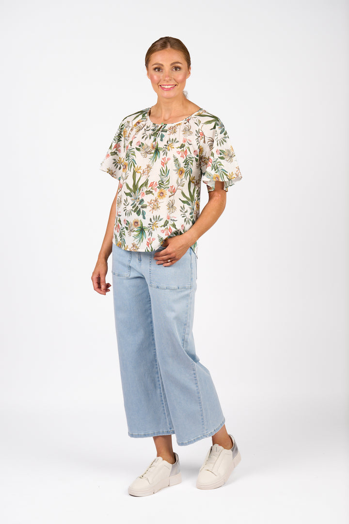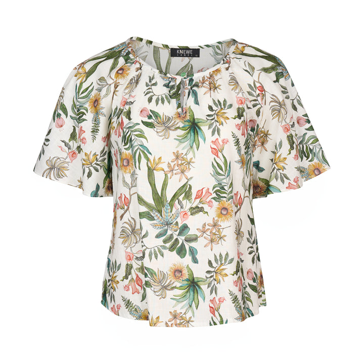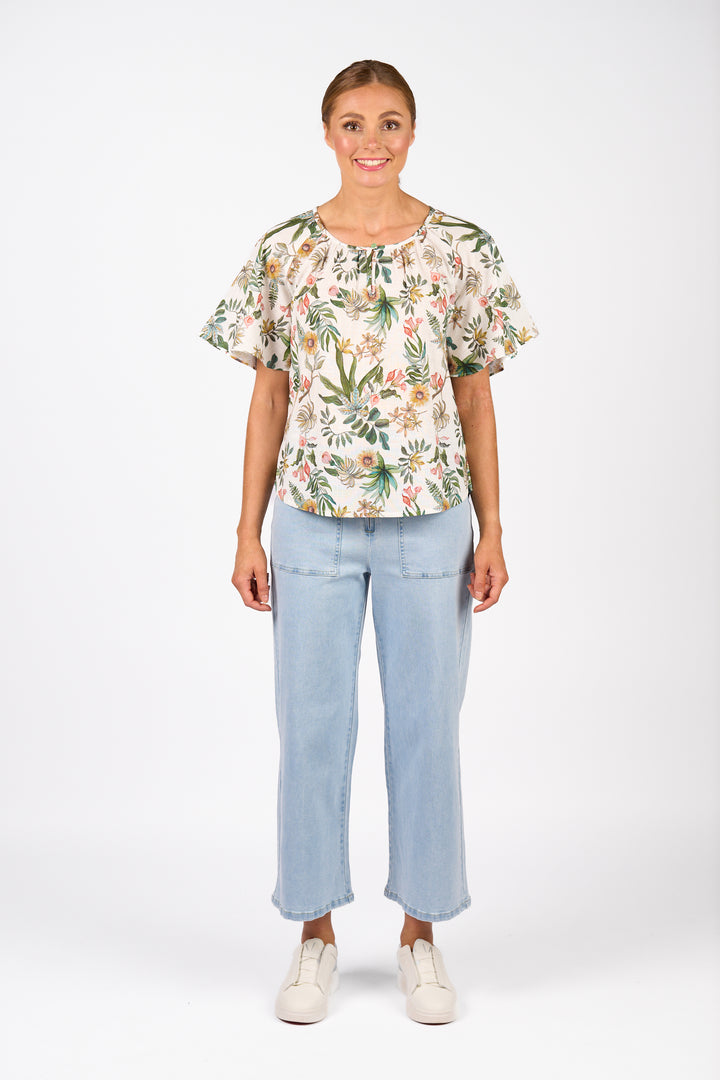 Made from lightweight 100% cotton with a linen look, this Hazel Top in Wild print features a bound round neckline with an enamel button and gentle gathers at front and back. Its floaty raglan sleeves and relaxed fit keep it breezy and perfect for warmer days.
