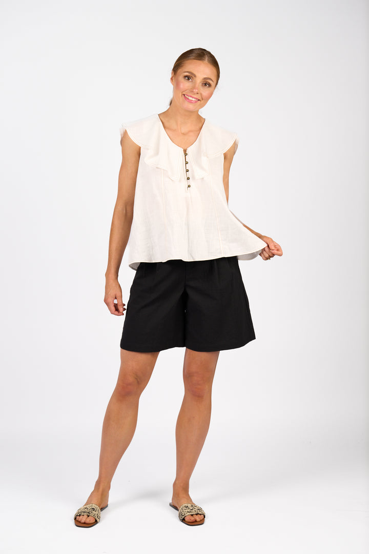 The Breeze Top in off-white is made from a lightweight cotton with a linen look. Its oversized bib collar curves over the shoulders and attaches to a softly gathered back panel, creating a relaxed and floaty silhouette perfect for warm days.