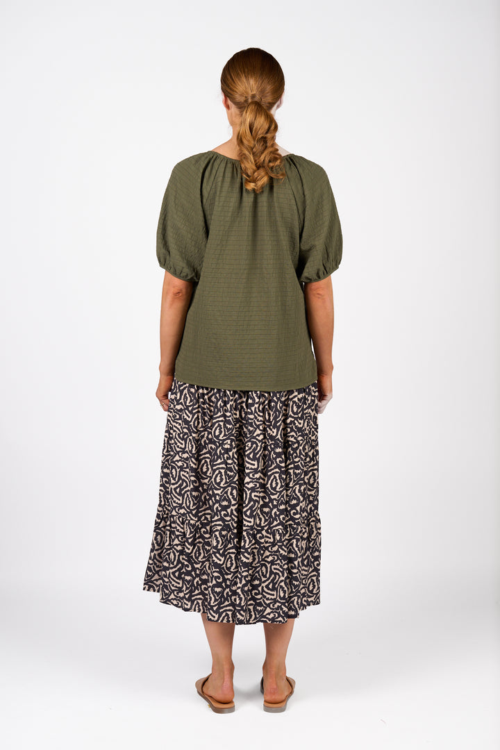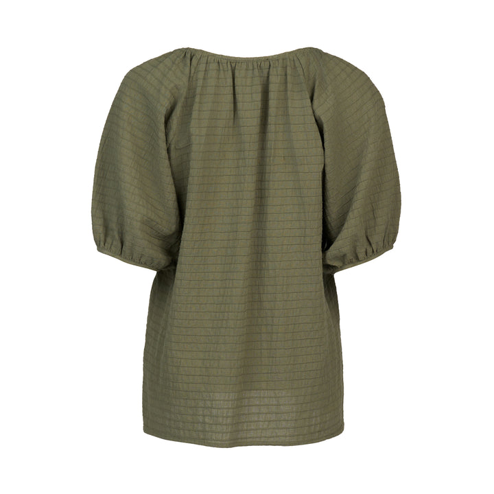 The Focus Top in olive is a floaty, relaxed summer essential made from lightweight cotton with a subtle horizontal seam texture. It features a flattering V-neck, short raglan puff sleeves, and a hem that dips lower at the back for effortless, breezy style.