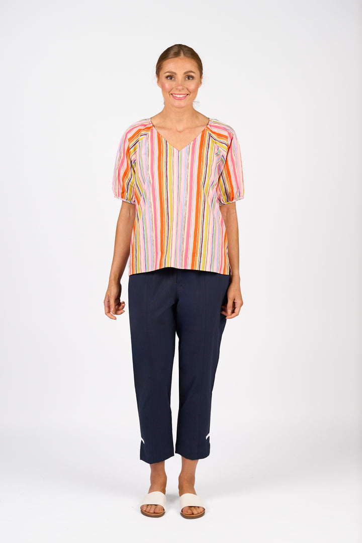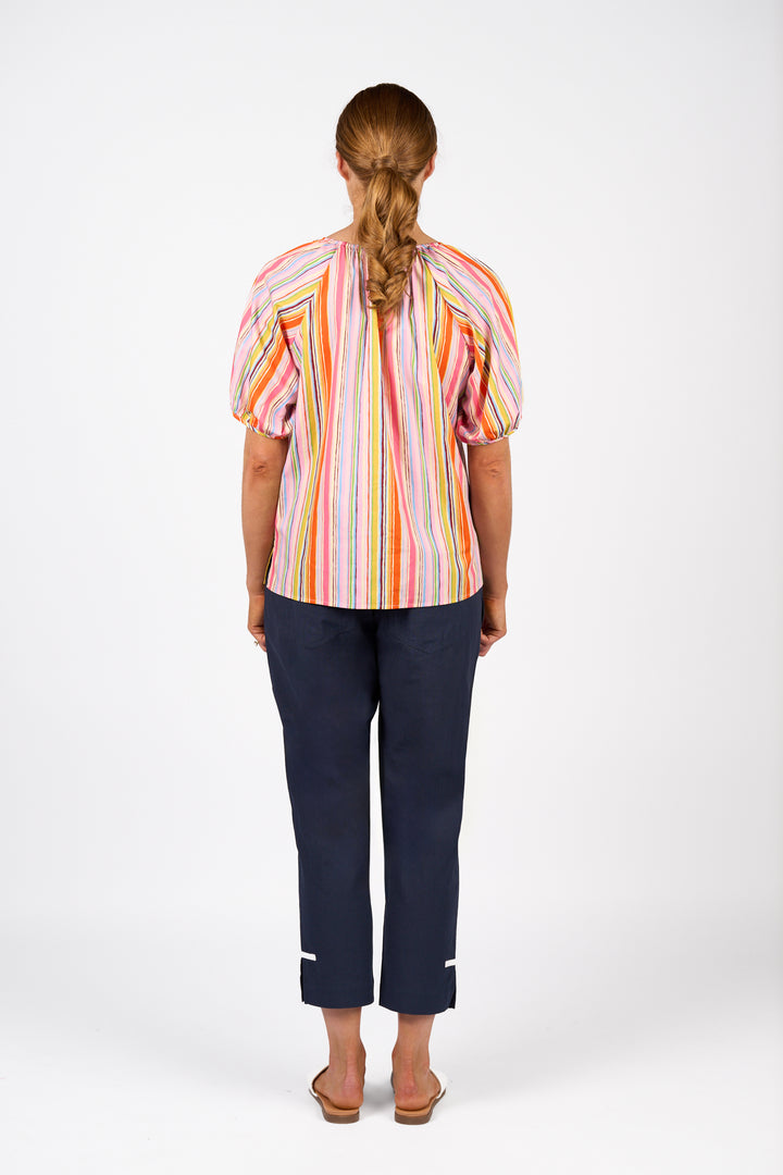 The Focus Top in Bonbon is a breezy summer staple, made from soft 100% cotton in vibrant stripes. With puffed raglan sleeves and a dipped back hem, it brings an easy sense of fun to warm weather dressing.