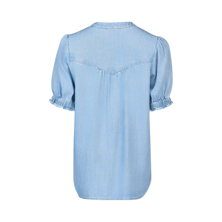 The Naomi Top is a relaxed summer favourite made from a soft, lightweight tencel fabric with a denim look. It features short puffed sleeves with shirring at the cuffs, a V-neck with a flat mandarin collar, and a button-up chest. The softly rounded hem dips lower at the back for easy, laid-back style.
