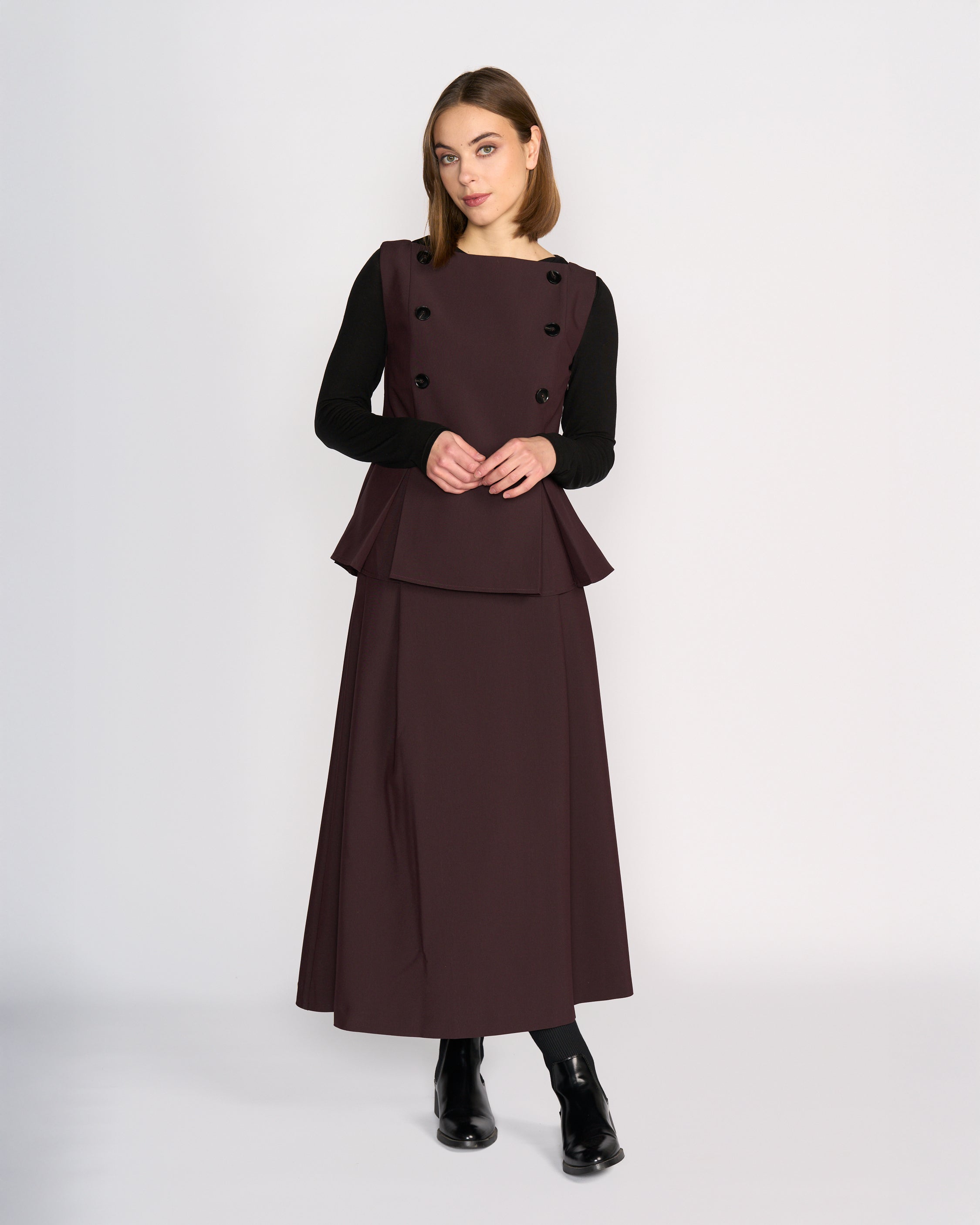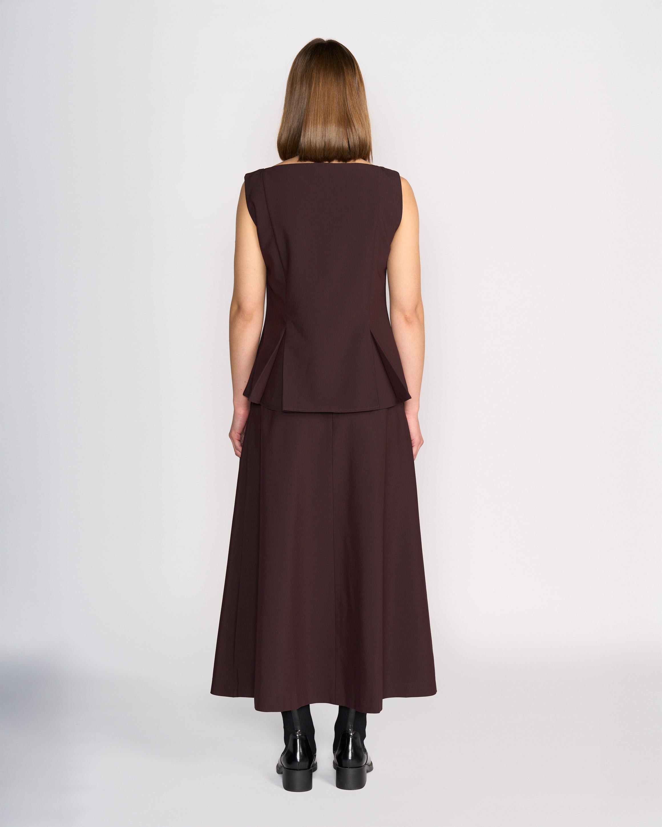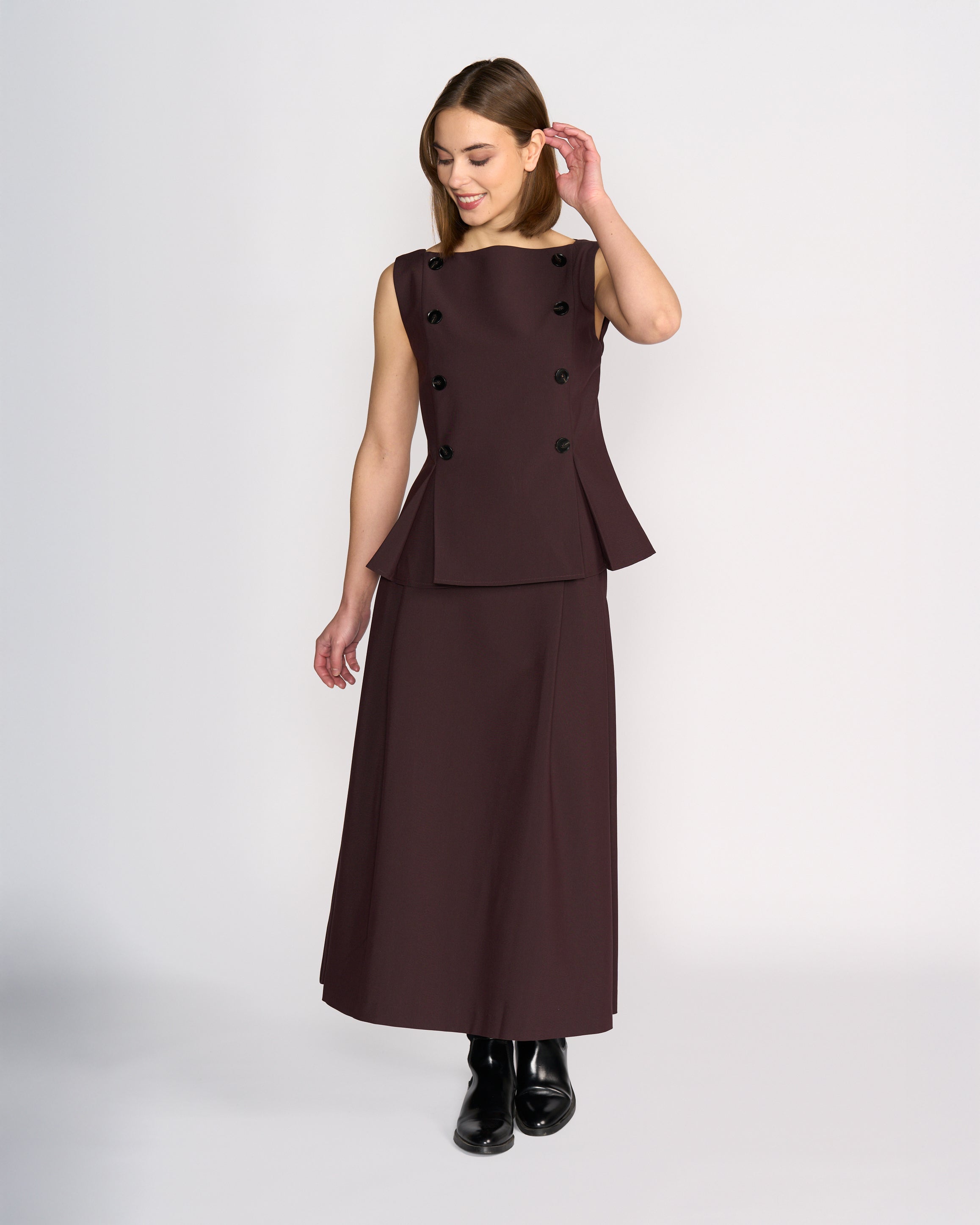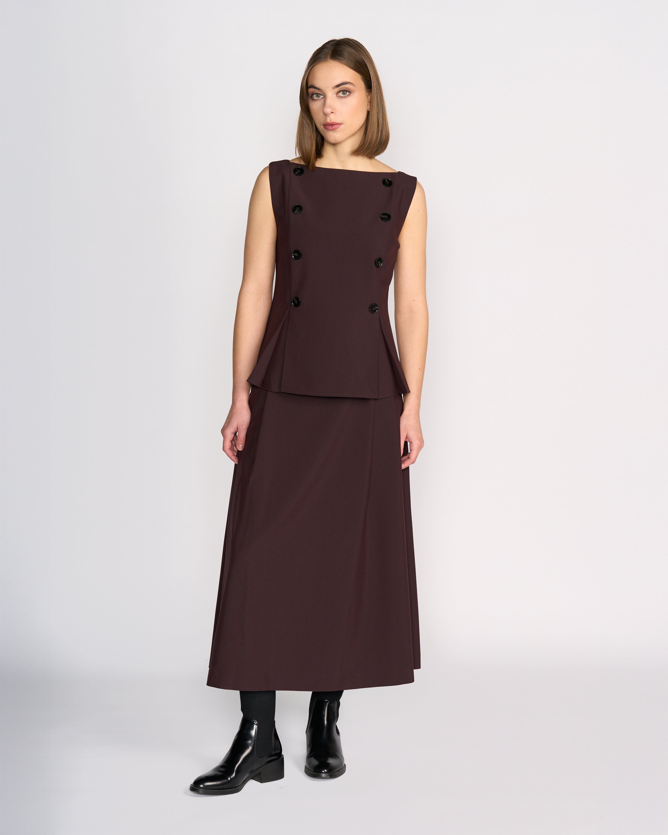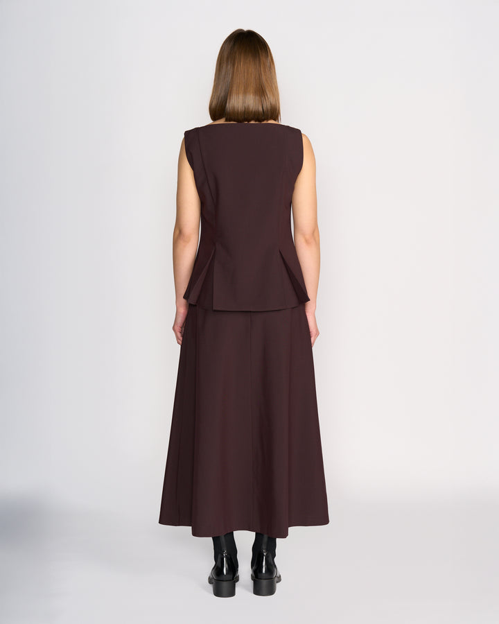 Sleeveless vest-style top in Raisin, a rich purple-brown tone. Designed with an open boat neckline and a tailored fit through the waist, this lined piece features pleat detailing at the hem on both the front and back for a flared look. Finished with black button detailing at the front, it offers a structured and refined silhouette.