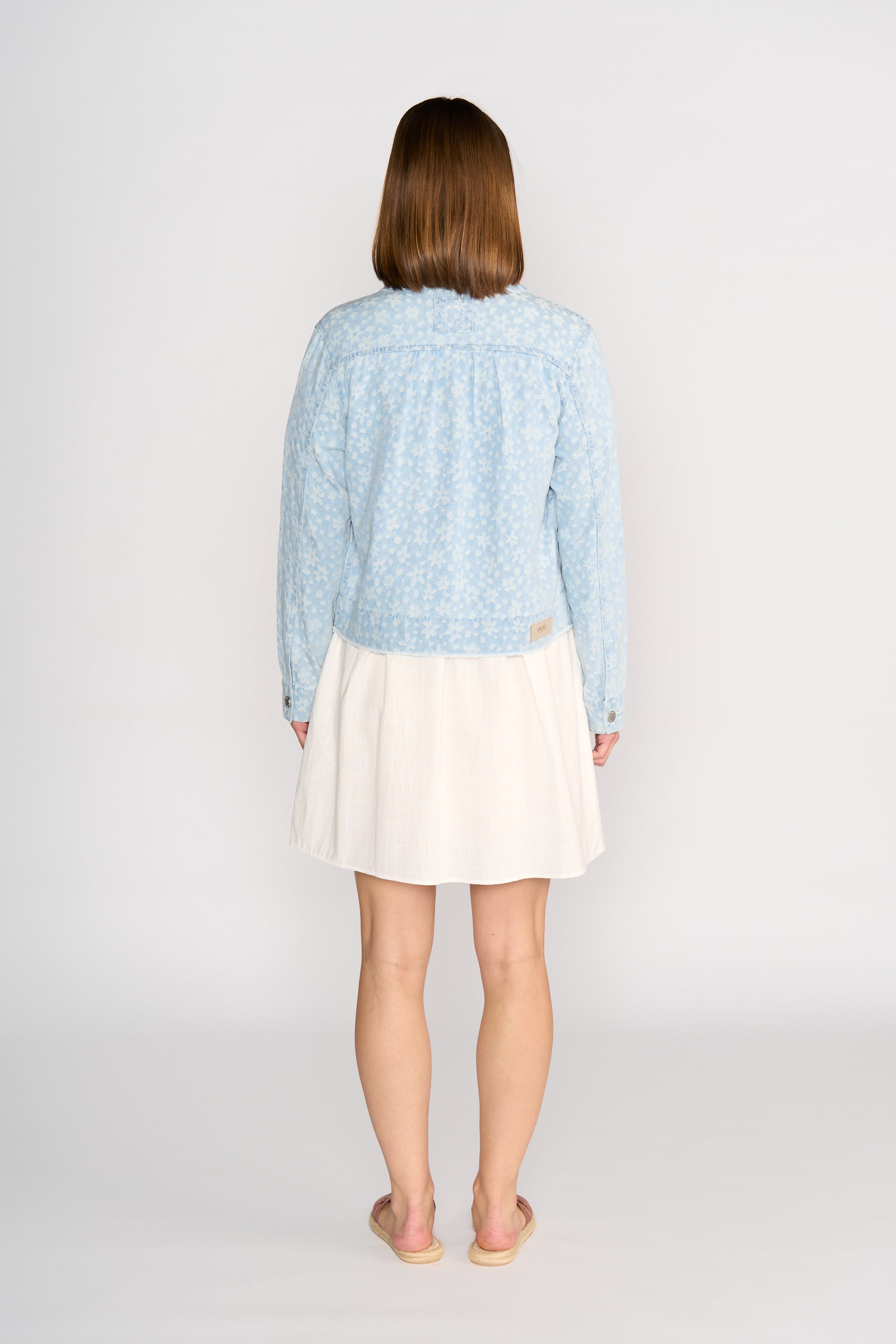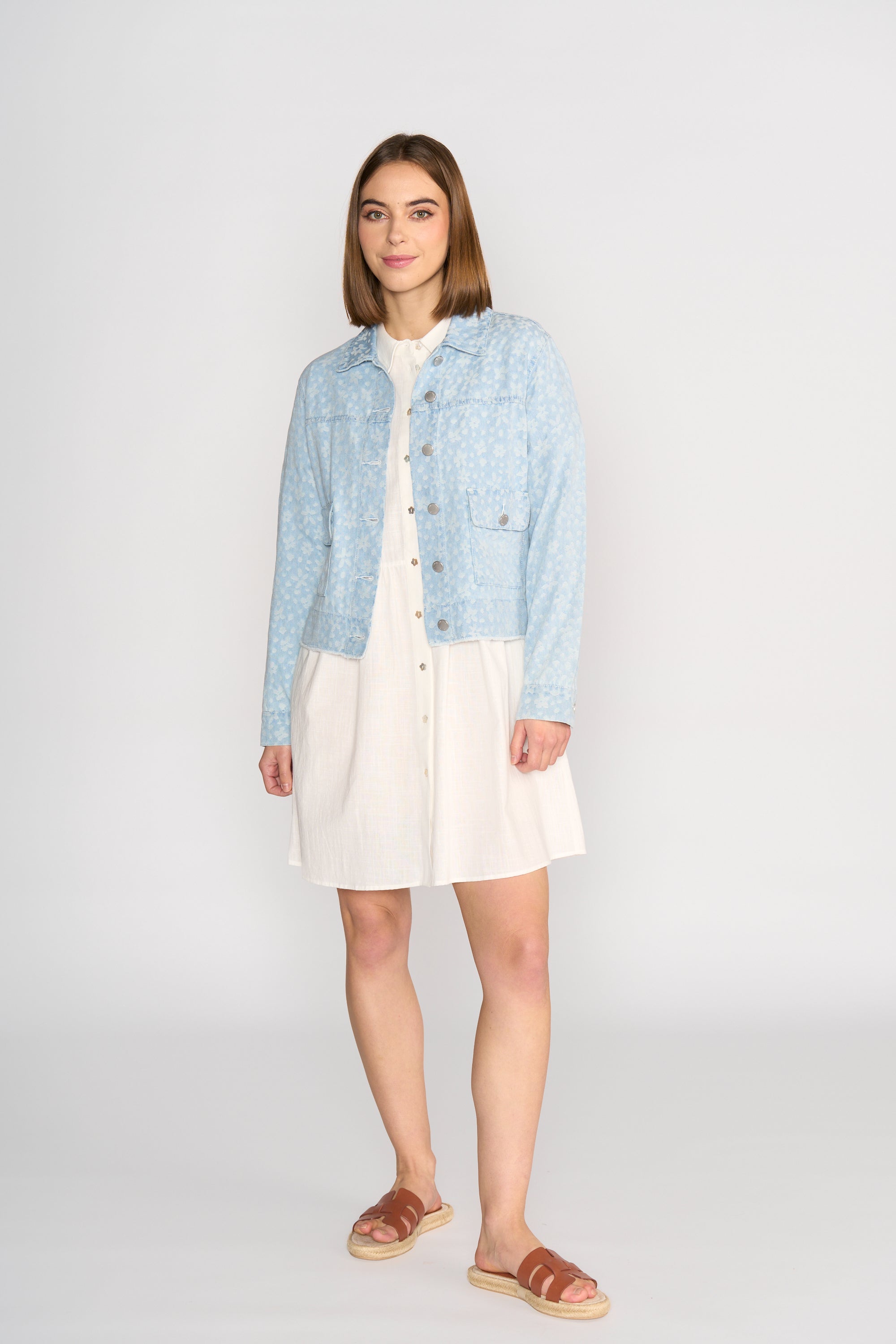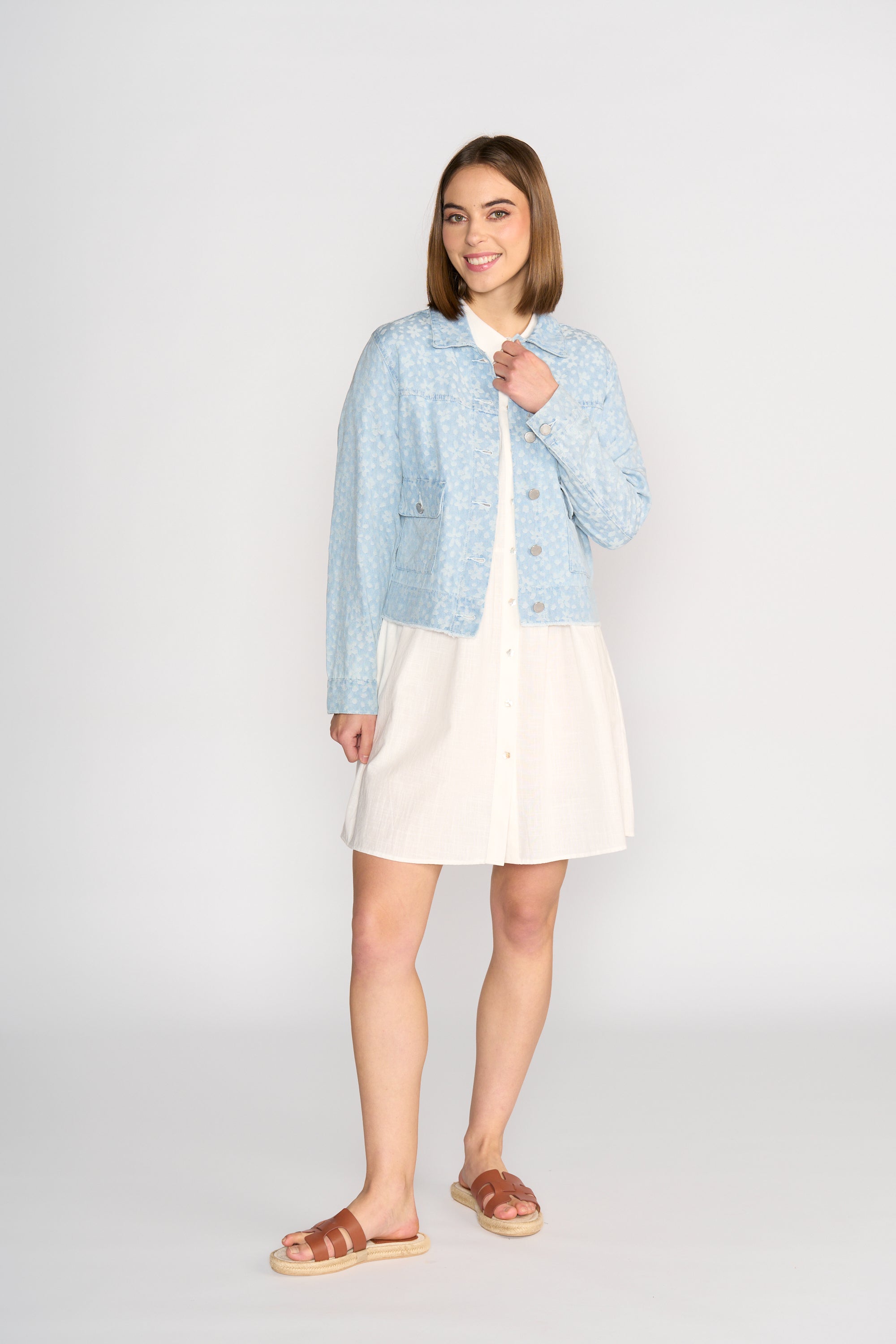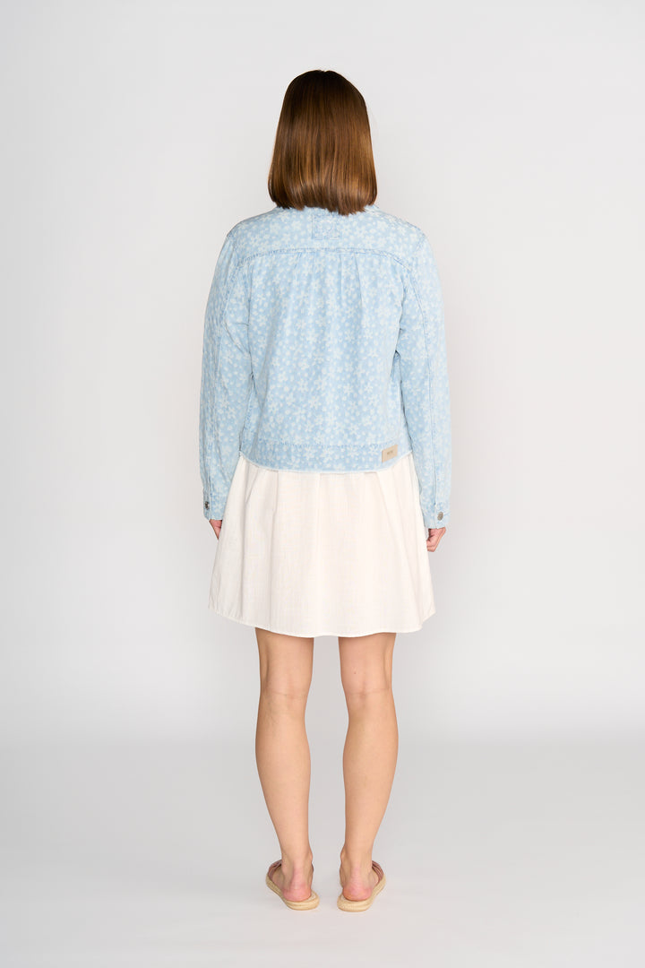 The Jagger Denim Jacket brings a fresh twist to a classic style with its all-over floral pattern in soft white. Made from stretch denim, it offers a comfortable fit while adding personality to simple outfits.