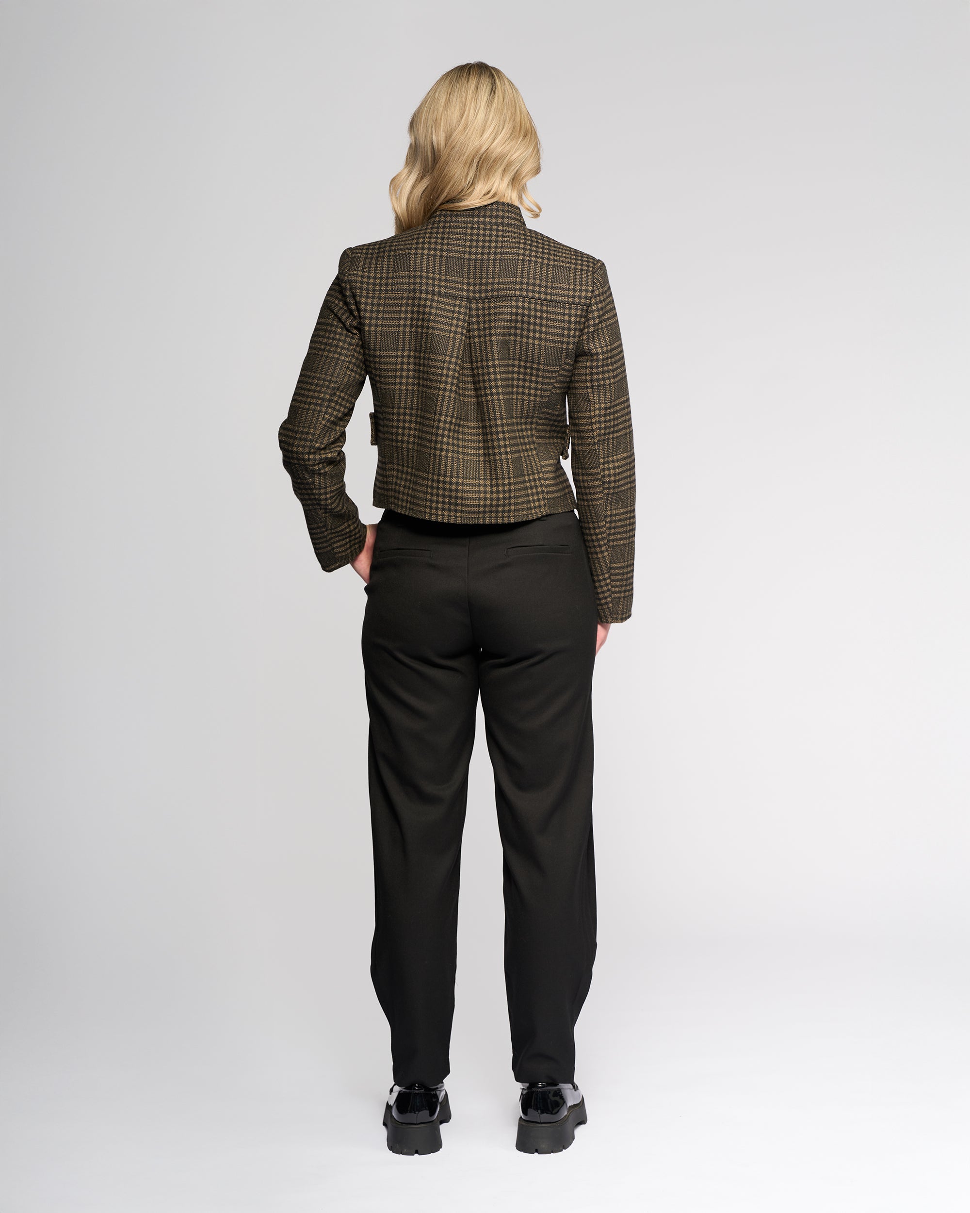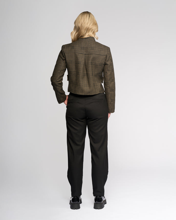 A cropped, fully lined jacket in our Check fabric, made from warm winter-weight material. Designed with a short stand collar and subtle shoulder shaping, this style features eight black marbled buttons down the front, with one set of four used for closure to create a clean, streamlined finish.