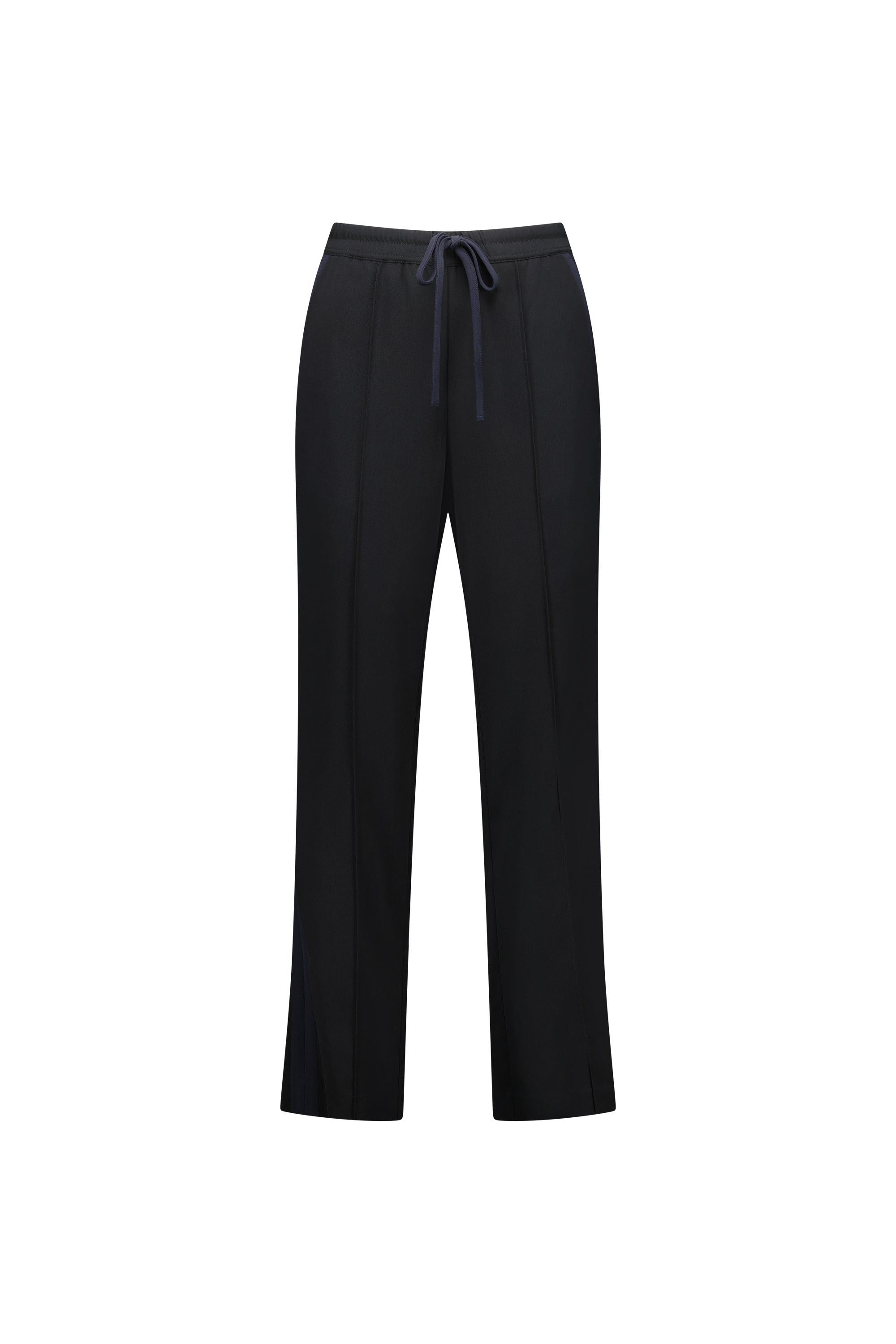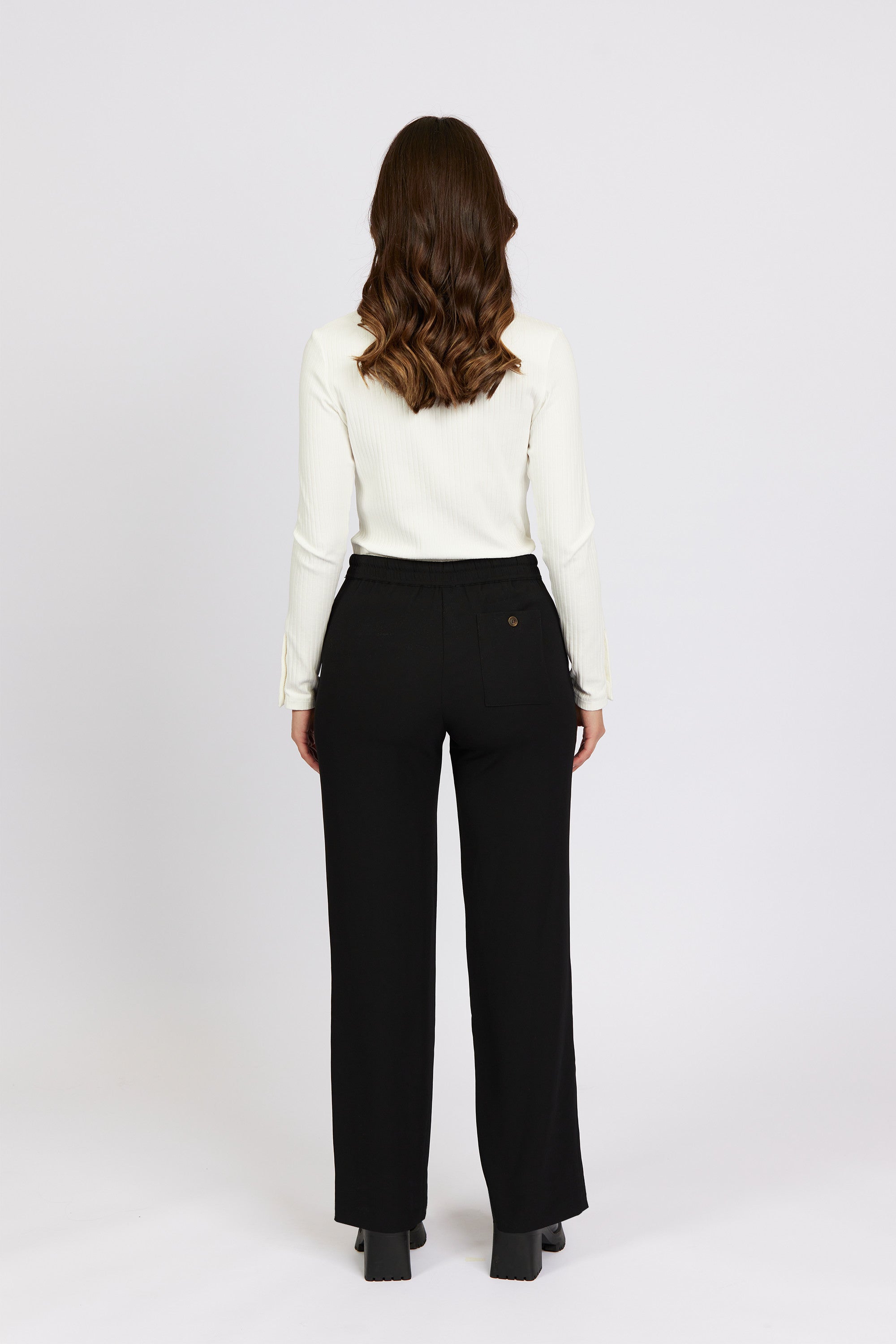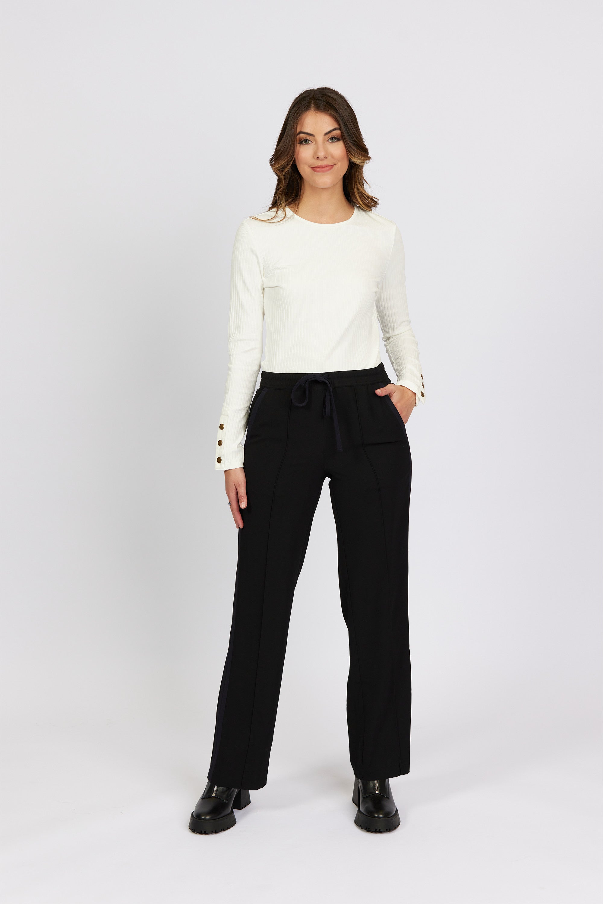 The Bowie Pant in Black/Ink combines sporty detail with effortless style. Featuring a straight-leg fit, contrast side stripe, and elastic waistband with drawstrings, it offers both comfort and edge. Finished with side pockets, a back patch pocket with a tortoiseshell button, and a clean blindstitched hem.