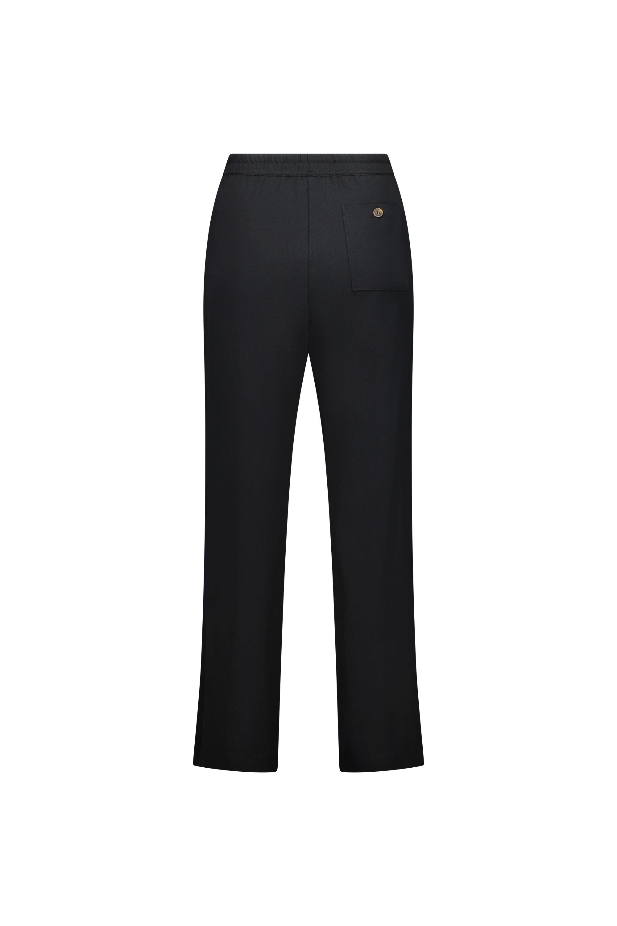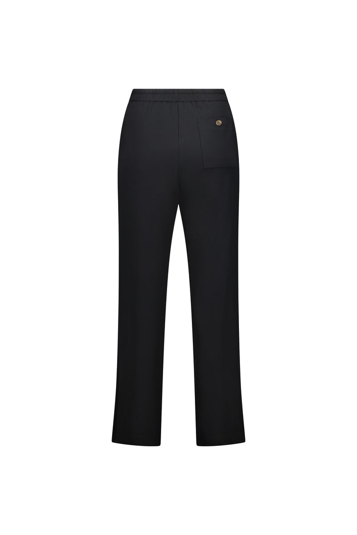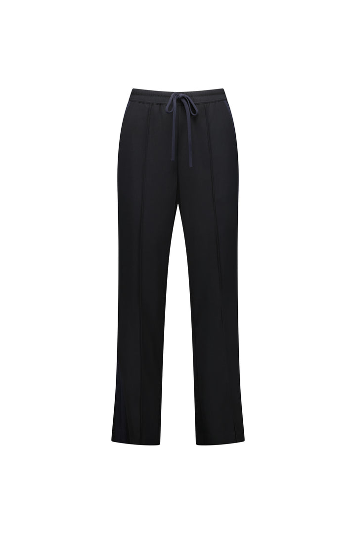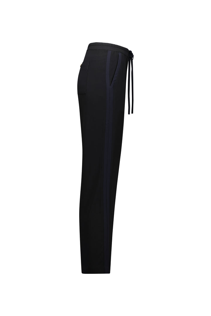 The Bowie Pant in Black/Ink combines sporty detail with effortless style. Featuring a straight-leg fit, contrast side stripe, and elastic waistband with drawstrings, it offers both comfort and edge. Finished with side pockets, a back patch pocket with a tortoiseshell button, and a clean blindstitched hem.