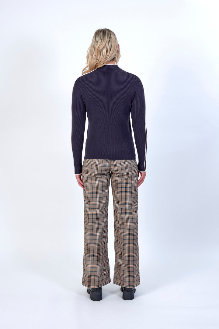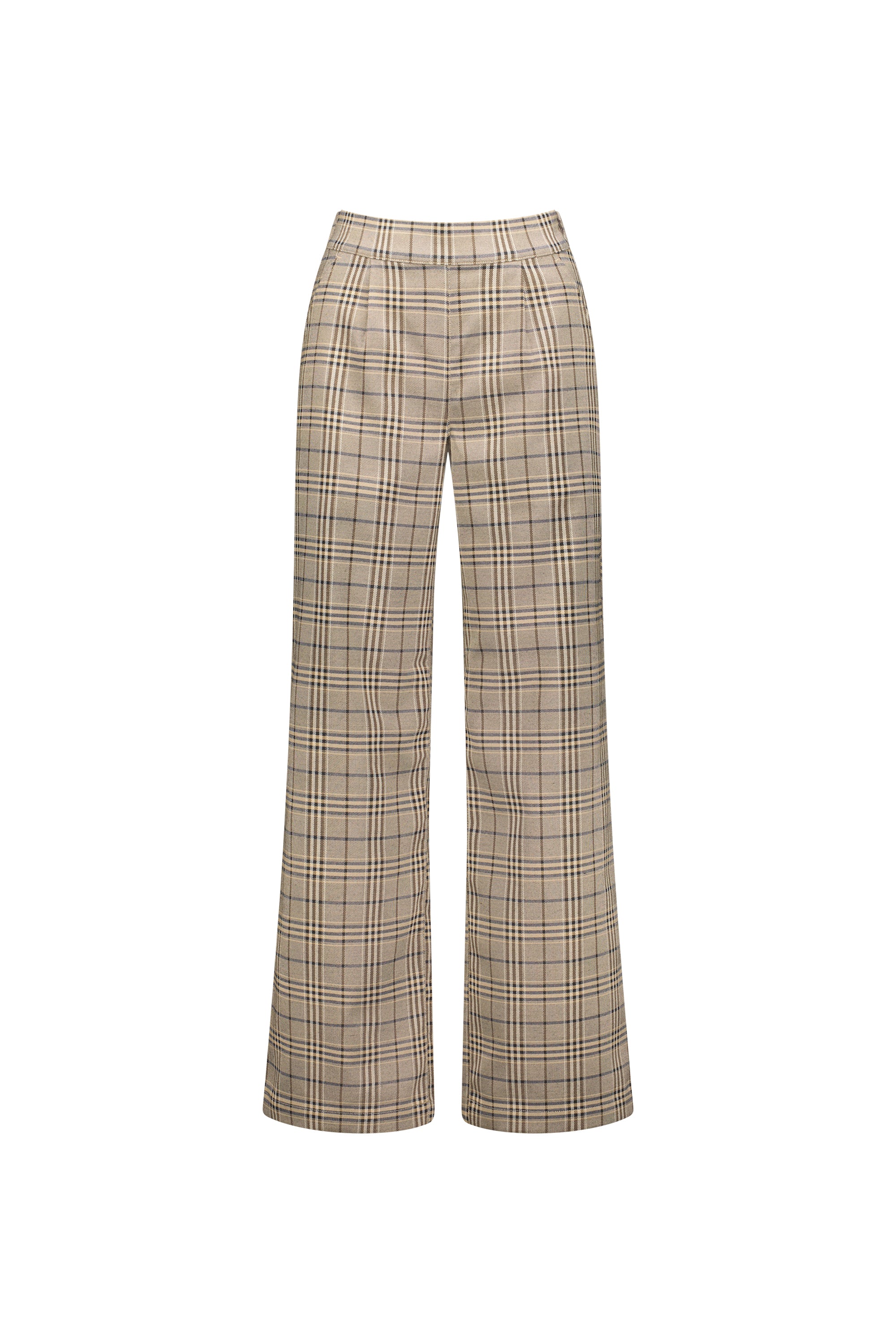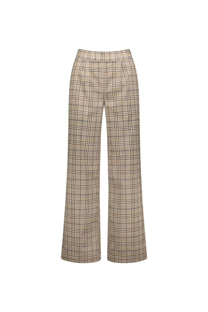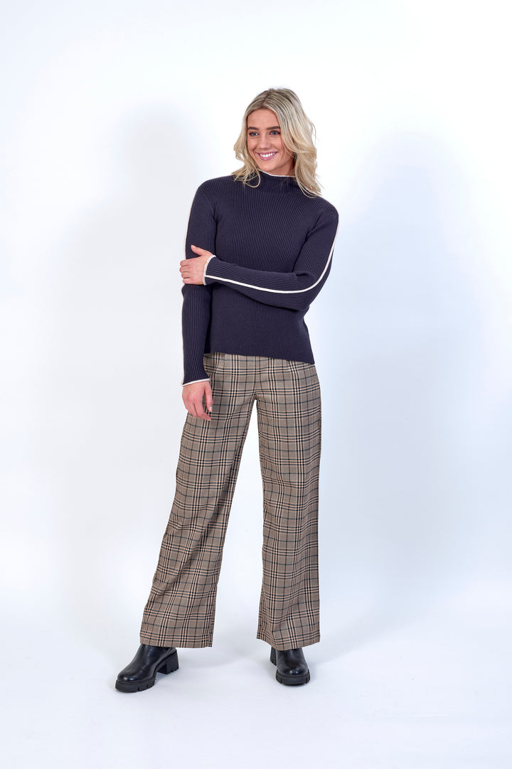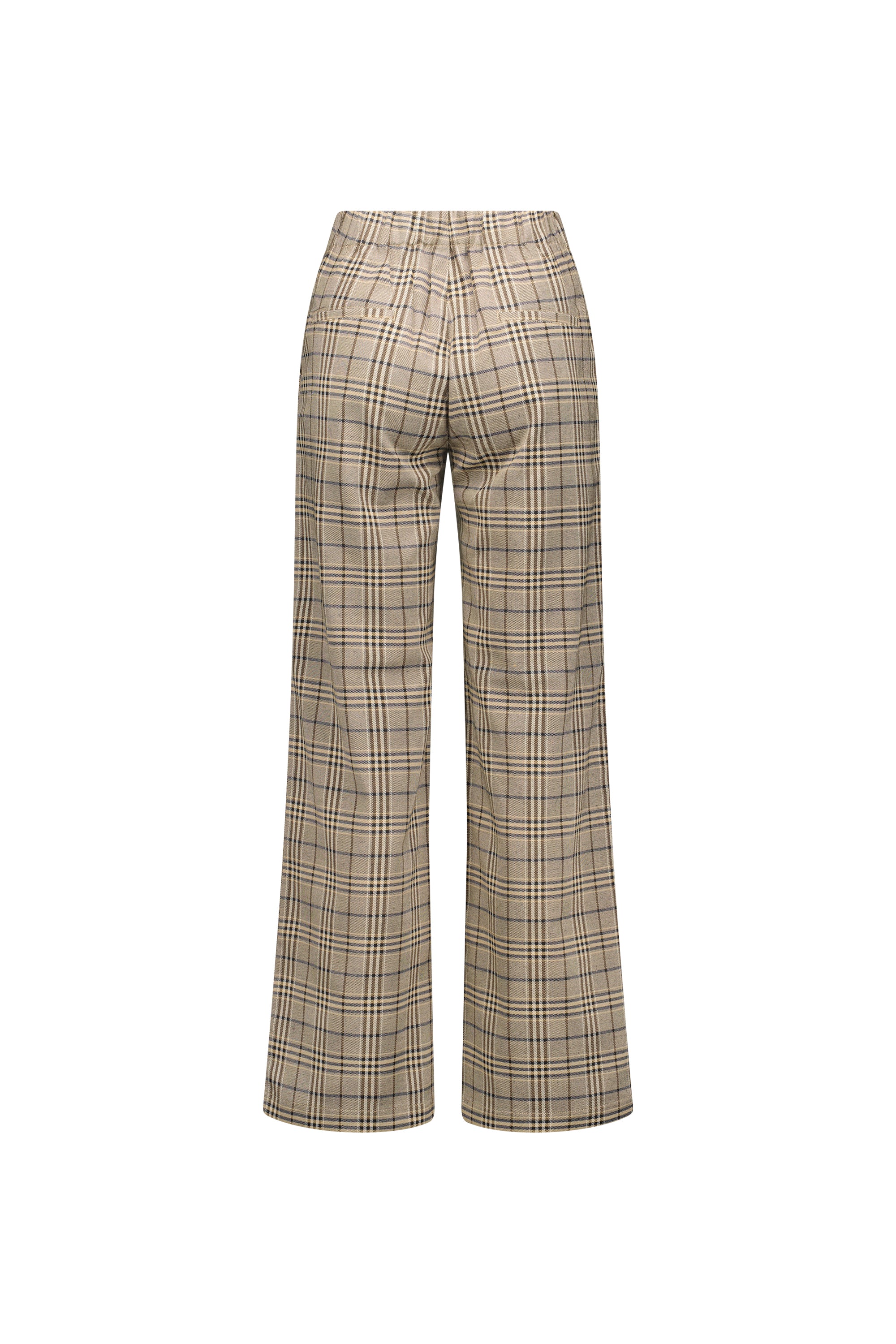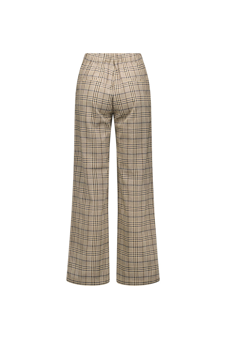 The KNEWE LABEL Como Wide Pant in Twig Check is a full-length, wide-leg pant featuring a flat front waistband with an elasticated back, side invisible zip, and front pleats. It includes angled side pockets, two faux welt back pockets, and is shown on a model wearing size 10.