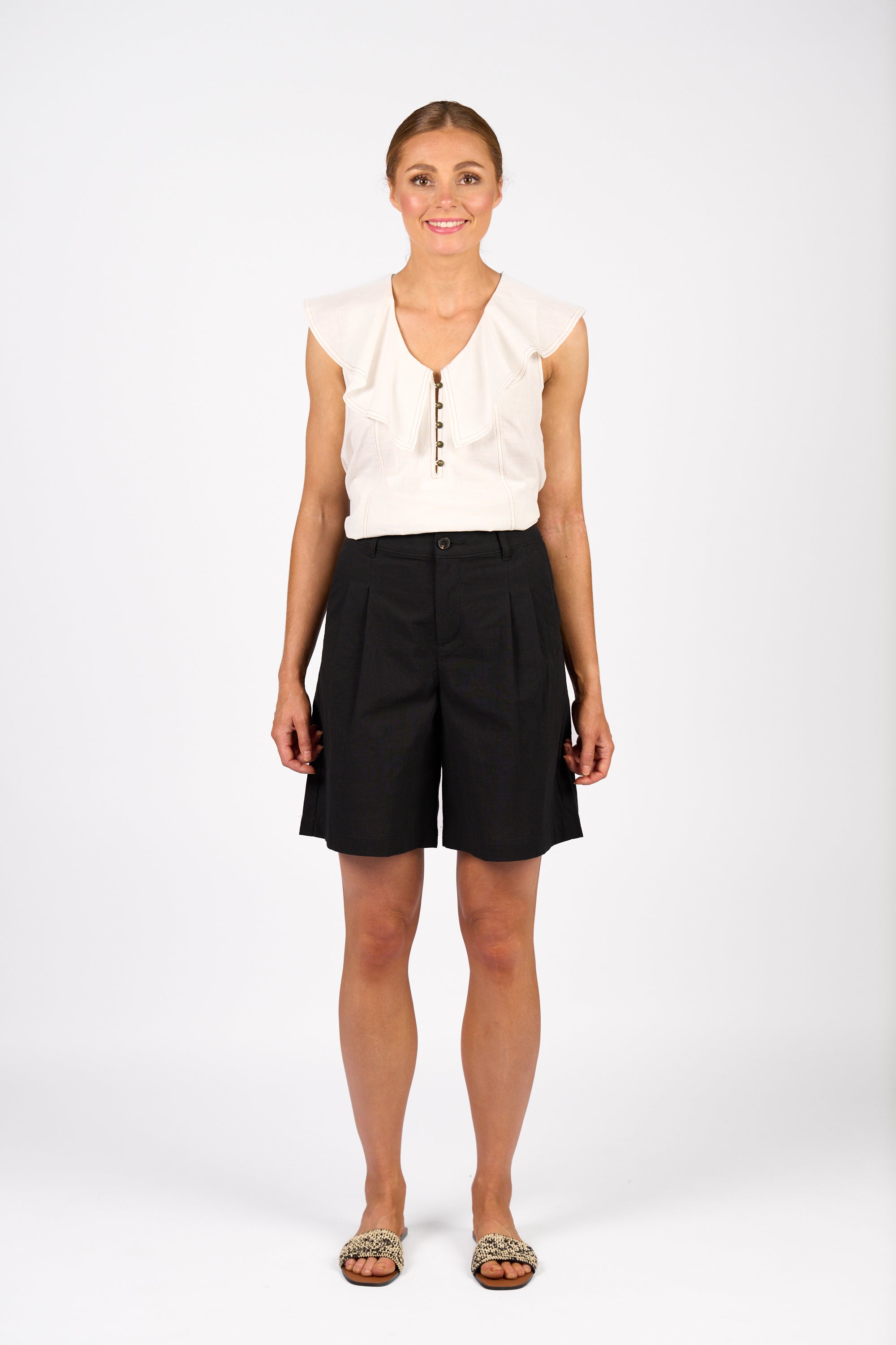 The Flynn Short is a breezy summer style in lightweight cotton with a linen look. Designed with a wide leg fit and practical side slash pockets, it features a marble button closure and beltloops for a polished finish. Perfect for staying cool and comfortable on warm days.