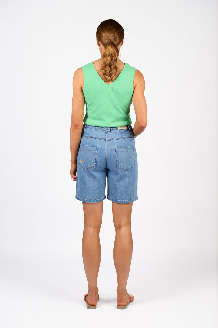 Made from midweight denim, the Spin Short is a wide-leg style with a laid-back feel and a little edge. It features front and back patch pockets with silver rivets, a standout O-ring zip closure, and a sweet embroidered heart on the back pocket for a playful finish.